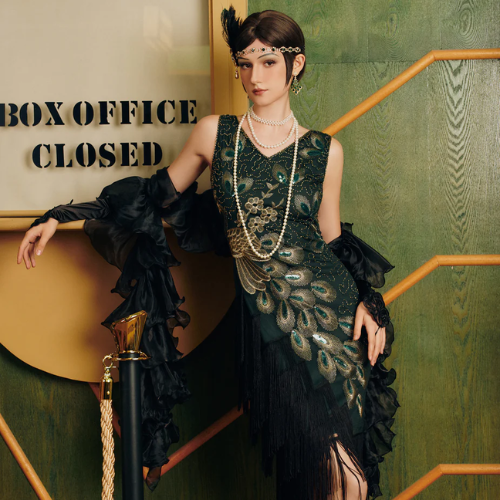 This dress captures the essence of 1920s fashion with its vintage-inspired, retro design, similar to a majestic peacock showcasing its charming plumage.