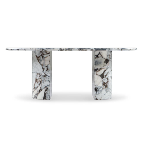 Buy the Dante dining table in Modellato marble, 98 inches, for $3,599 instead of $8,990 on sale at Interior Icons. You can also pay interest-free monthly installments of $325.00. There are four different styles to choose from, ensuring a perfect match for any luxurious interior. Coated in Italian Modellato marble from top to bottom, the Dante dining table is the ultimate statement piece. This reimagined classic double pedestal table is designed to elevate contemporary, luxe interiors. Featuring two demi-lune pillar legs and a generous 98” oval table top, the Dante dining table accommodates extra place settings with ease, making it ideal for those who love to host.